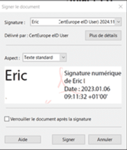 - Cliquez sur "Signature électronique" et placez en fin de document l'encart qui affichera la signature