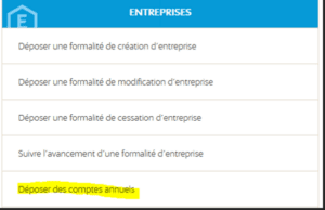 Dès que vos êtes entré dans votre compte ouvert sur le Guichet Unique, cliquez sur « Déposer des comptes annuels ».
